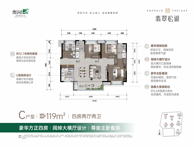 為滿足客戶暢享全景四季鮮氧生活需求,翡翠松湖在戶型上極力打造寬幕尺度。其中,建面119㎡的4房2廳2衛(wèi),擁有約12.7米南向面寬,約7米寬境大橫廳,讓業(yè)主無論是居家還是接待客人均顯氣派。另外,該戶型約5.6米寬境陽臺與客廳相連貫通,盡享無界景觀視野。太太的瑜伽,孩子的露營帳篷,父母的花草,生活點(diǎn)滴輕松容納。
