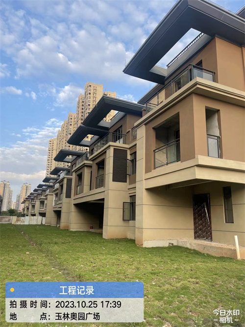 玉林奧園廣場別墅27#-29#、67#-68#幢主體結(jié)構(gòu)封頂,砌體、抹灰、鋁合金門窗、欄桿、室內(nèi)、外立面、園林、室外消防水管預埋、正式水、燃氣預埋、電表箱安裝已完成;消防栓完成50%;入戶線待施工;17#-18#、66#別墅道路硬化、綠化、正式水已完成。